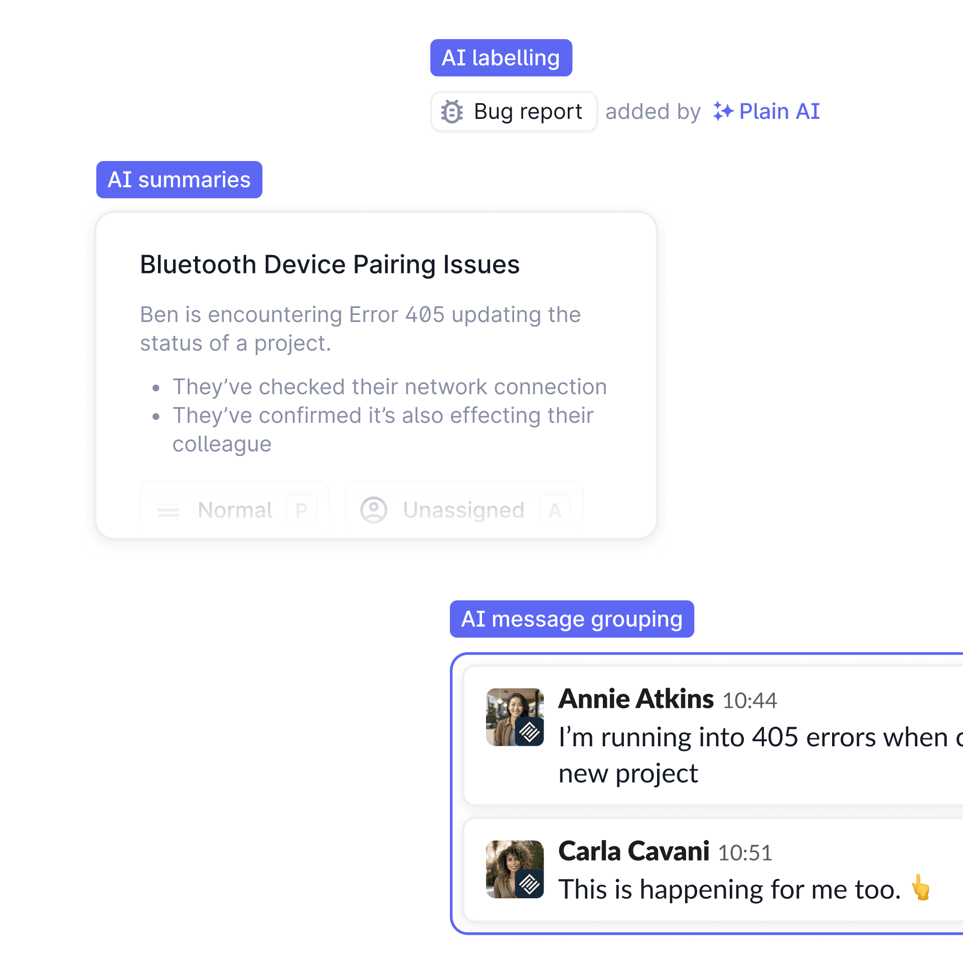 Plain AI is there where you need it, and otherwise gets out of your way. It summarizes issues for you, automatically labels customer threads, fills in thread fields, and groups messages where appropriate.